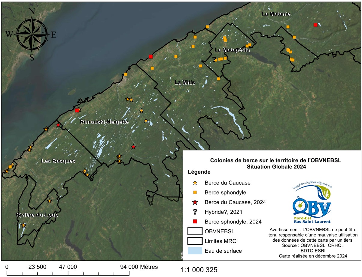 L’OBVNEBSL a été mandaté par le collectif régional de développement du Bas-Saint-Laurent pour effectuer le contrôle et l’éradication de la berce du Caucase sur son territoire de 2016 à 2022. Suite à ce, la gestion de ces espèces exotiques envahissantes est géré par l'entente sectorielle de développement pour la lutte contre les espèces envahissantes au BSL.