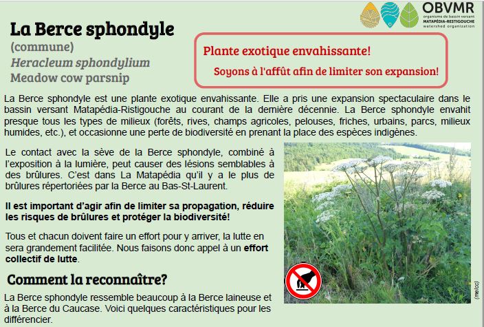 - Berce sphondyle (Heracleum sphondylium) : espèce exotique envahissante, elle a pris une expansion spectaculaire dans le bassin versant Matapédia-Ristigouche au courant de la dernière décennie. La Berce sphondyle envahit presque tous les types de milieux (forêts, rives, champs agricoles, pelouses, friches, urbains, parcs, milieux humides, etc.). Elle commence à prendre de l’ampleur dans la Mitis, la Matanie et Rimouski-Neigette.