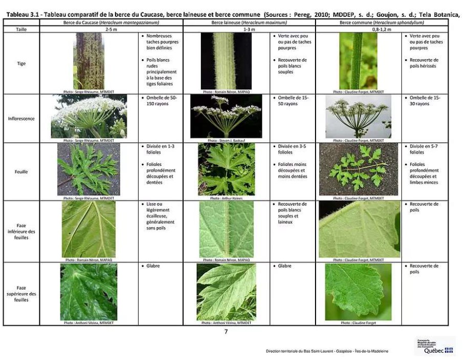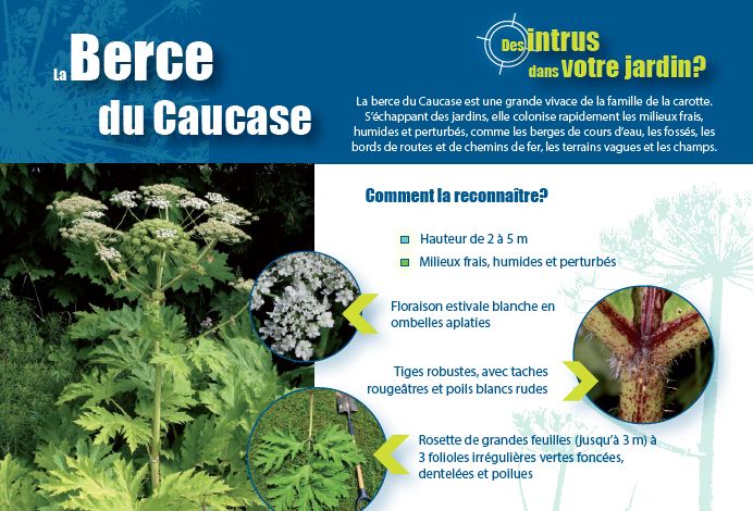 - Berce du Caucase (Heracleum mantegazzianum) : espèce exotique envahissante, elle est une plante originaire d'Eurasie qui a été introduite en Amérique par l'horticulture. Elle a été répertoriée au Québec pour la première fois en 1990. Impressionnante, elle peut atteindre 5 mètres de hauteur !