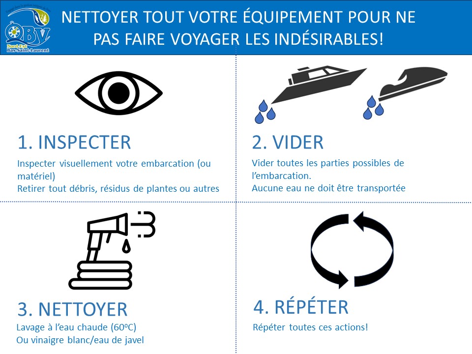 Afin de nous aider à prévenir la propagation des espèces envahissantes aquatiques dans nos cours d’eau, il est primordial de bien nettoyer les embarcations.