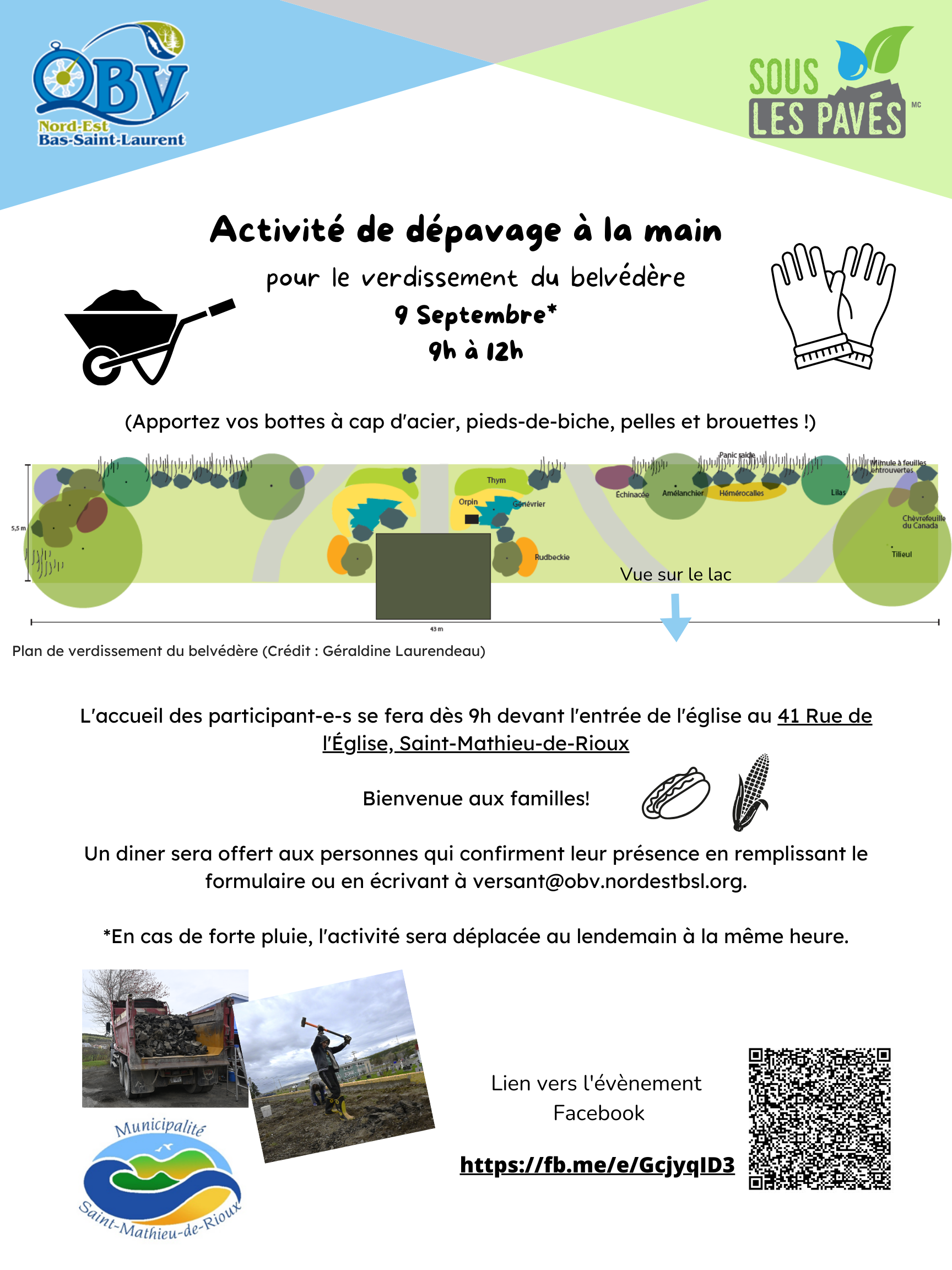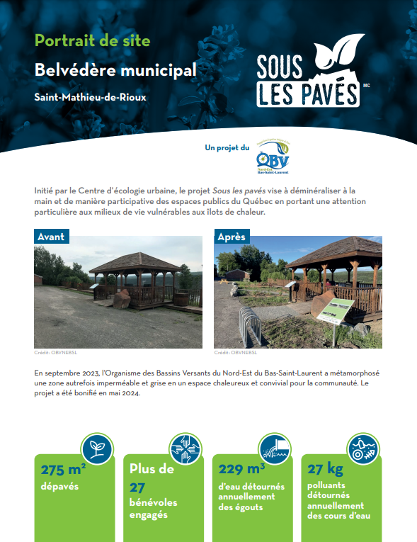 Ce projet a permis de retirer 275 mètres carrés d'asphalte devant la promenade et le gazebo du belvédère de Saint-Mathieu-de-Rioux afin d'y aménager un espace vert accueillant pour la communauté.