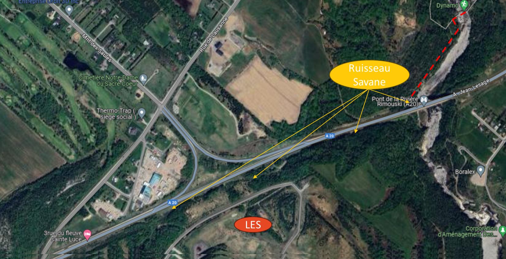 À la confluence du ruisseau Savane et de la rivière Rimouski, toutes les conditions sont réunies pour former un refuge thermique. Cependant, les stress multiples d'origine anthropique comme la présence de métaux, de pesticides, d’engrais, ou autres pourraient affecter à court et long terme la qualité du refuge. Le ruisseau de la Savane longe l'ancien lieu d'enfouissement sanitaire (LES), l'autoroute A20 et traverse en amont d’importantes zones agricoles.